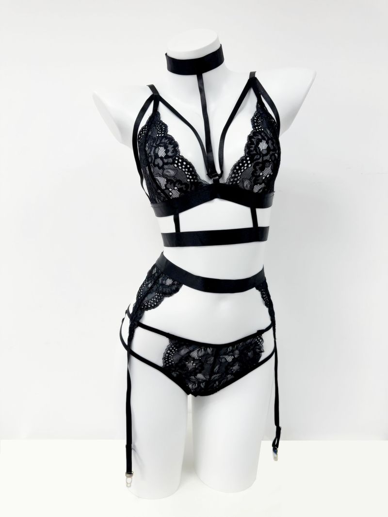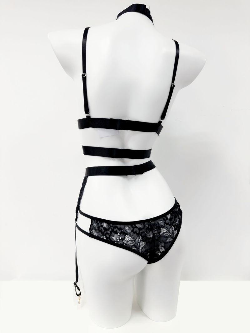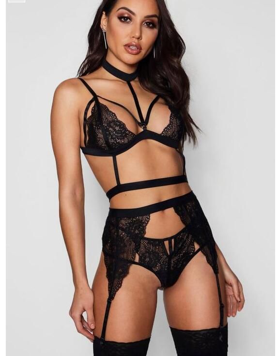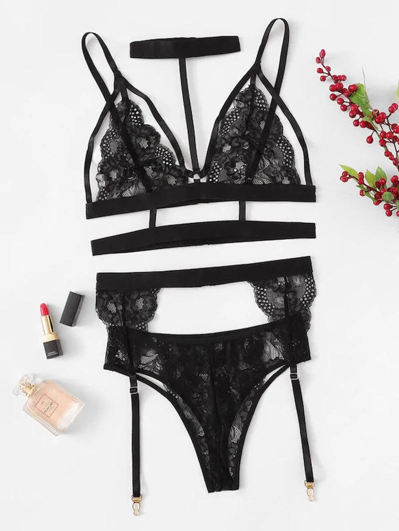 JSMANA New Arrival Women's Sexy Mesh Hollow Black Halter Lace Bra and Panty Three-Piece Suit Lingerie Set With Garter